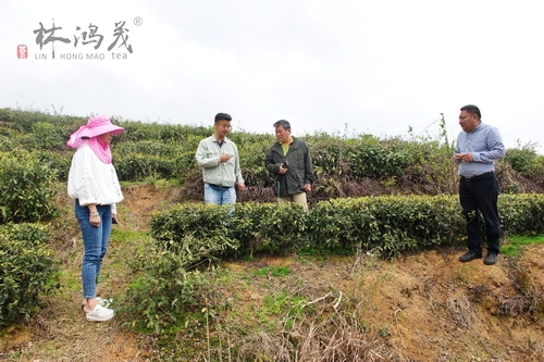 2020年3月27日,新合作农资尤义平总经理前来开展农资合作,吴文玉总经理陪同考察公司茶园。